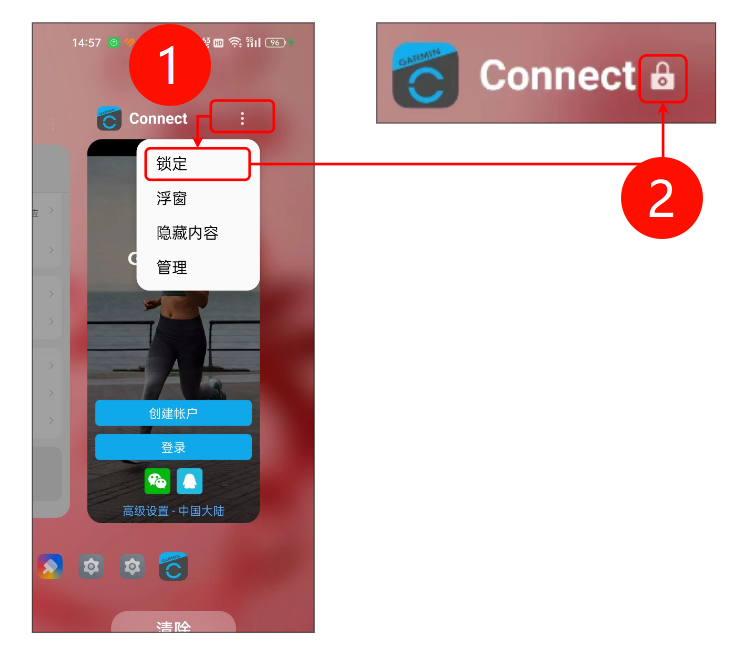 (手势:底部上划,停顿约1秒后松开),按图锁定